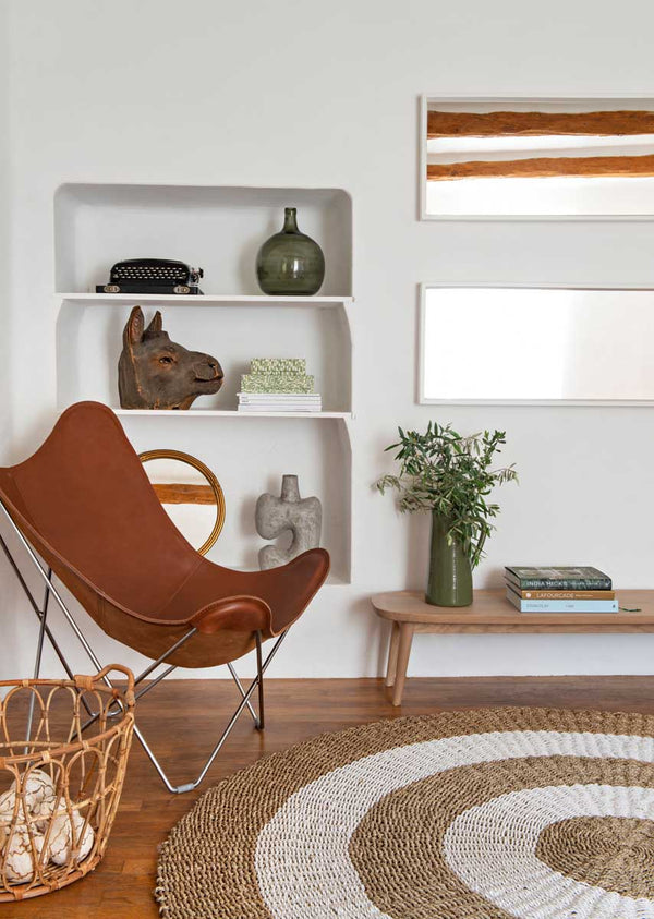 minimal, in a palette of natural materials, including stone, linen, leather and